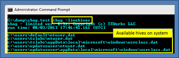 Once the path of the location of the user hives are known, one can parse any of the desired hives by passing in the path of the active hive. For this type of live processing, sbag will take care of taking a snapshot of the requested hive by reading the appropriate raw NTFS clusters and then proceed to extract the artifacts from the snapshot.