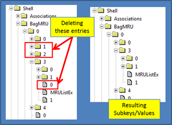 Occasionally sbag will come across entries in the shell bag hierarchy that are missing. This most likely occurs by deleting certain entries and leaving others. Empirical data suggests that the operating system does not do this. So when this occurs, it was most likely intentionally done with anti-forensics in mind. When considering these types of cases, there are two possibilities: (a) those that have subkeys that are deleted and (b) those that have values that are deleted. The graphic below shows both of these cases.